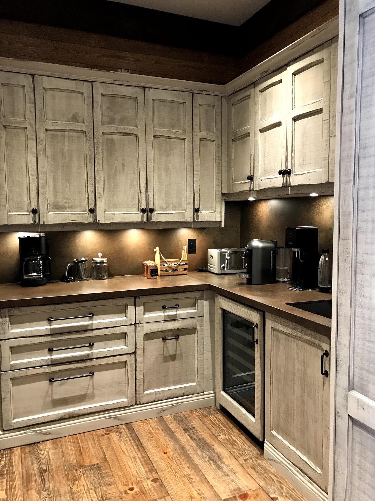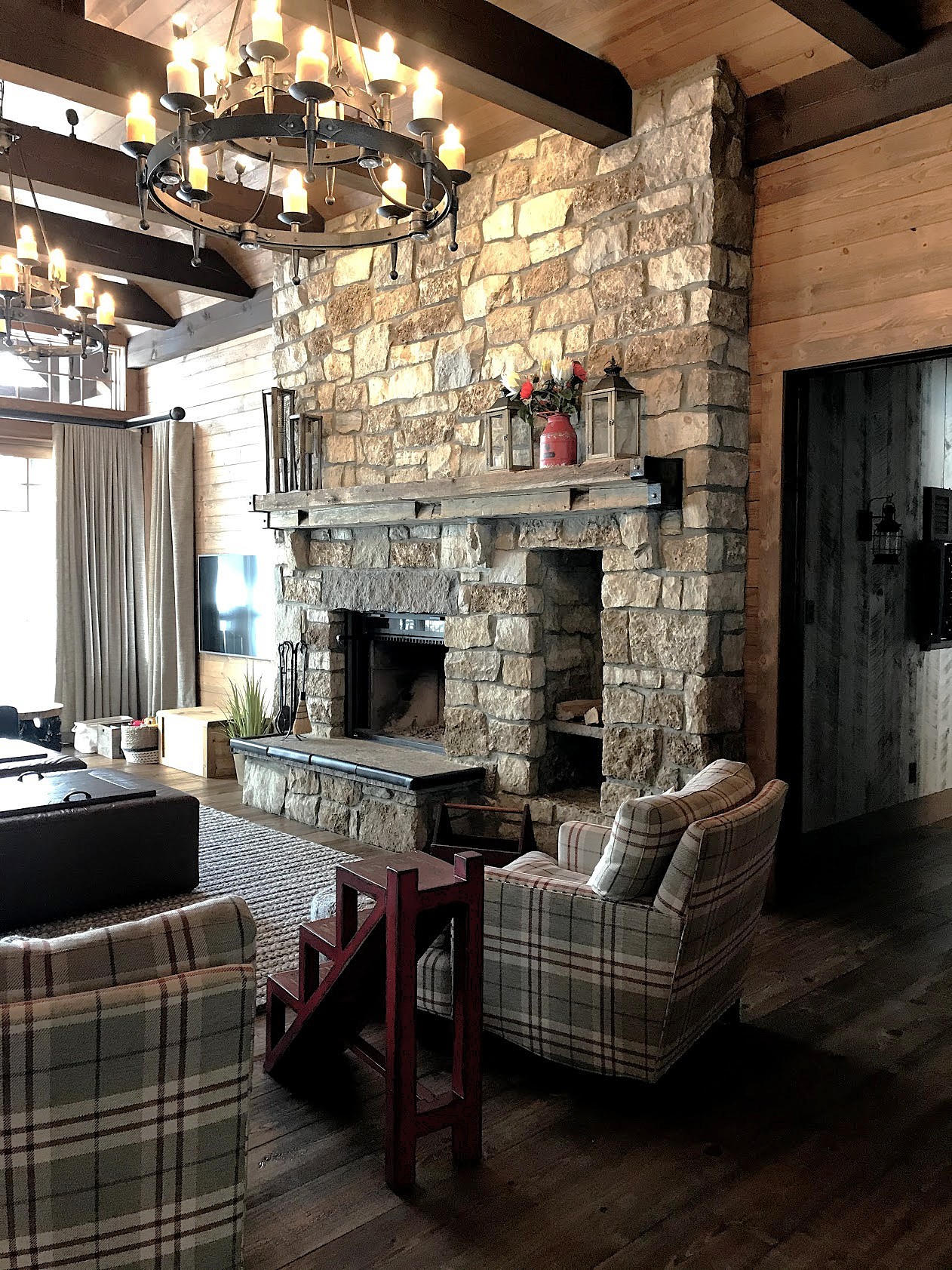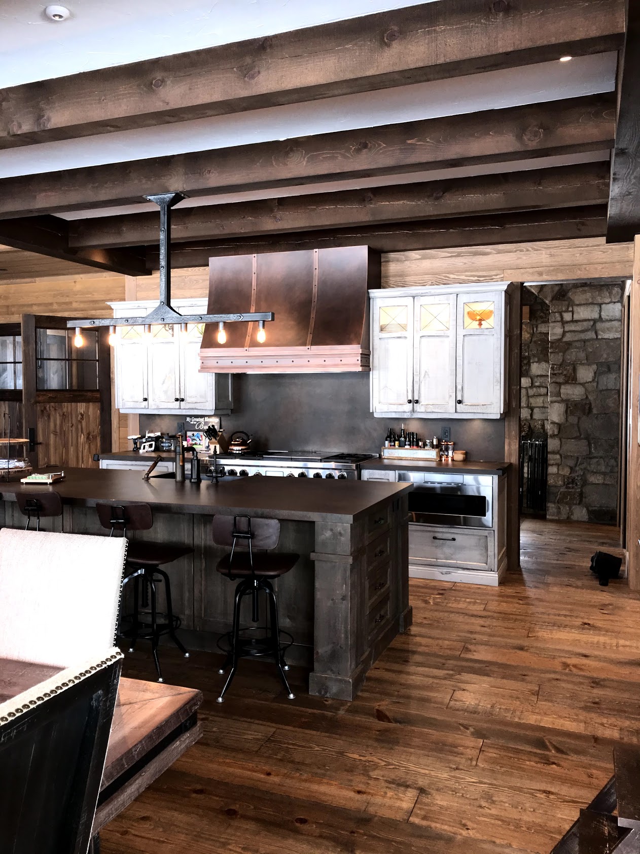 Evidemment la cuisine est au coeur du chalet, les clients ont opté pour une configuration contemporaine mais un look rustique ainsi qu’ un “garde manger walkin” en retrait pour compléter la préparation et rangement lors de grands repas.