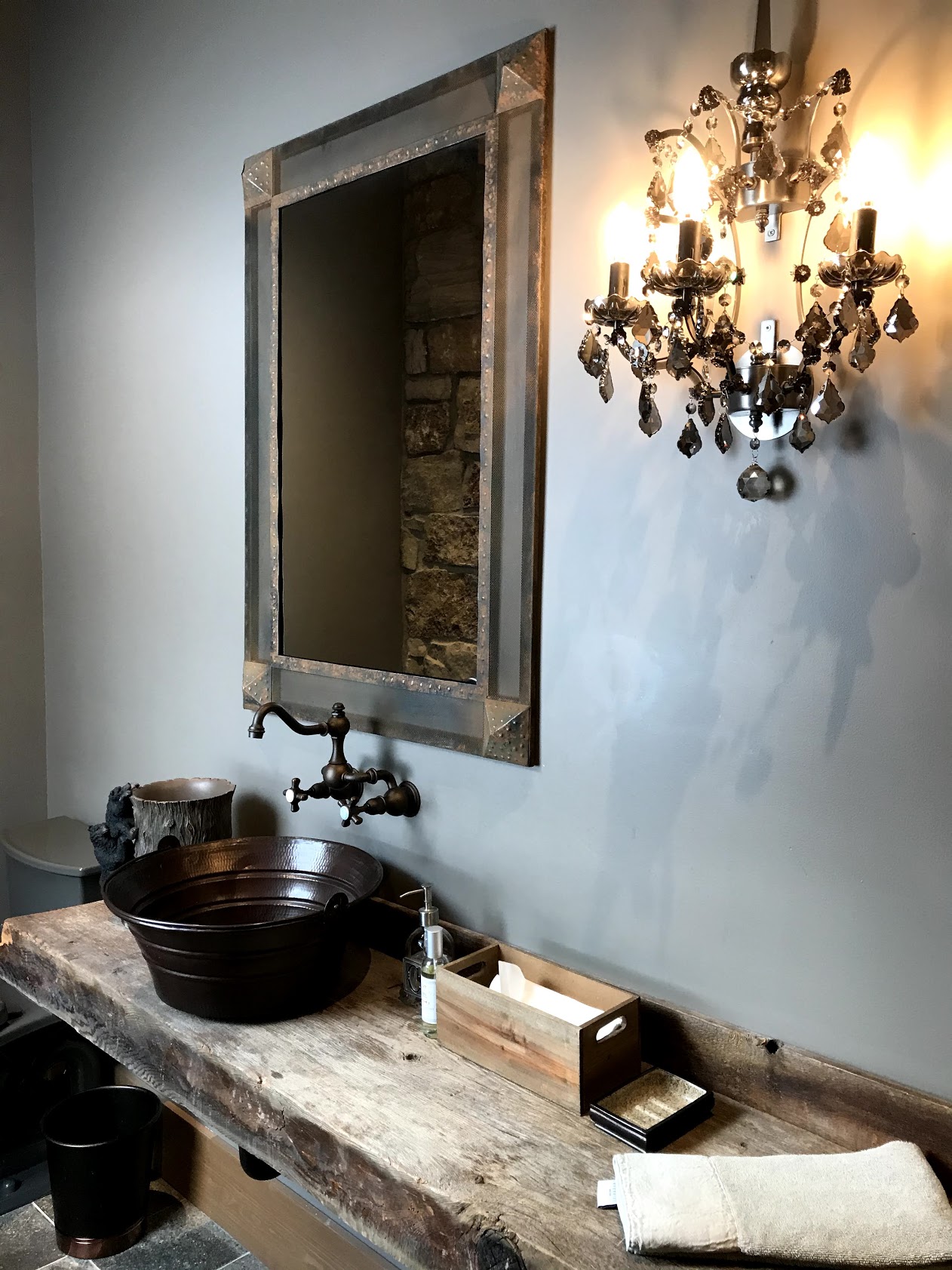 Nous nous en sommes donné à coeur joie pour sélectionner les matériaux, mobiliers et éclairages afin de concrétiser le rêve de nos clients. Tout est surdimmensionné dans ce chalet…plafond de plus de 10pieds et fenestration hors norme. Nous devions donc porter une attention particulière lors de la conception du canapé modulaire de plus de 14pied et de l’emplacement du téléviseur FRAME qui permet de diminuer l’impact visuel de celui ci.