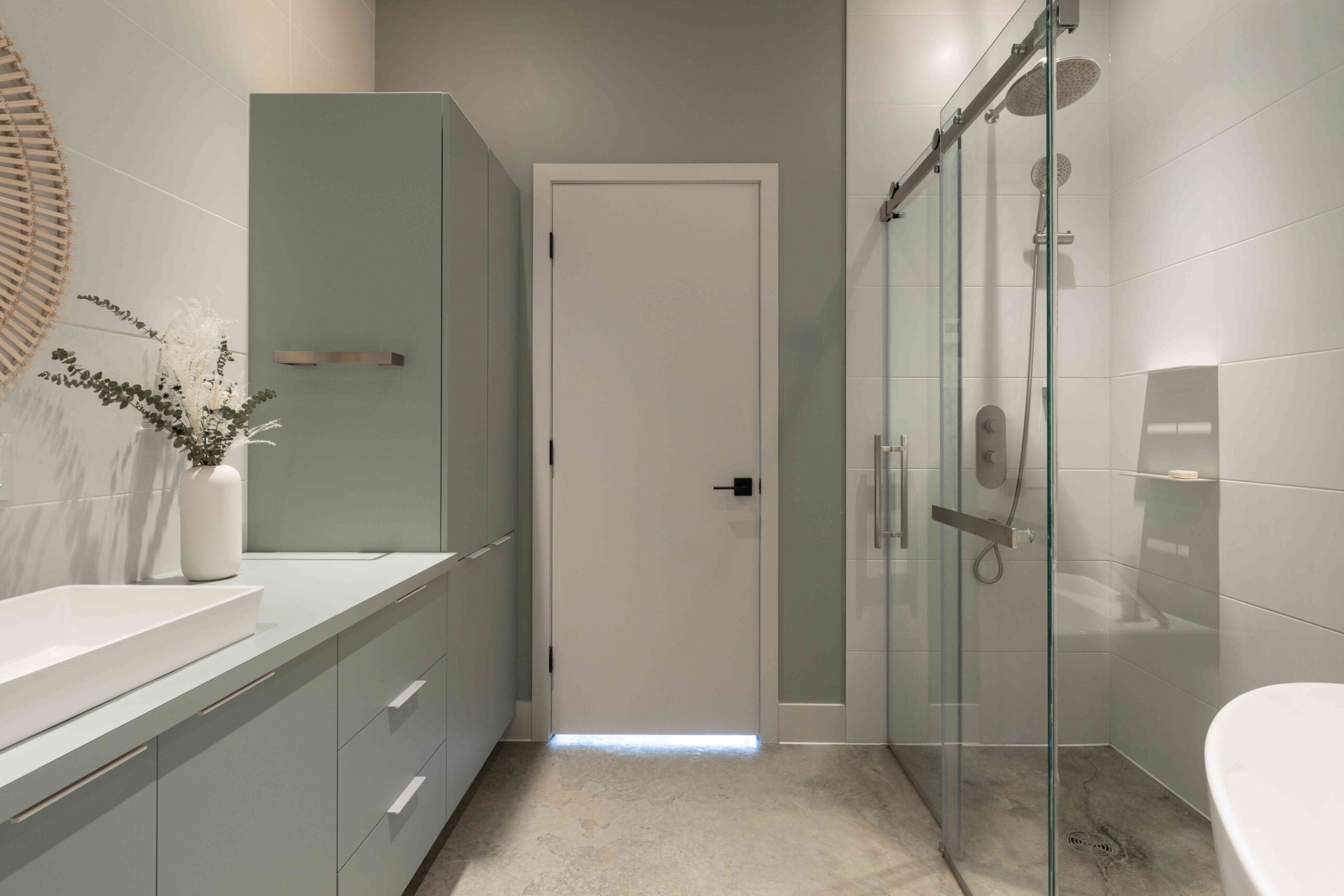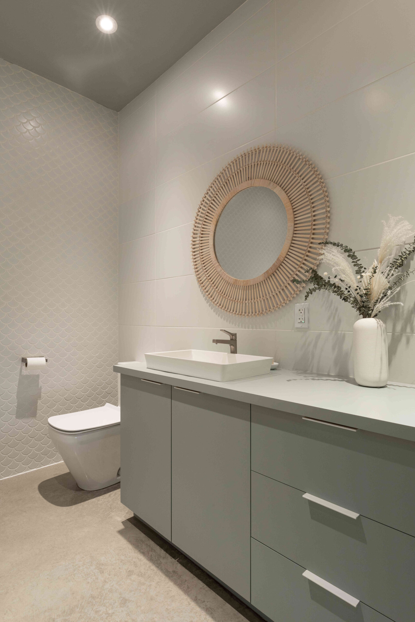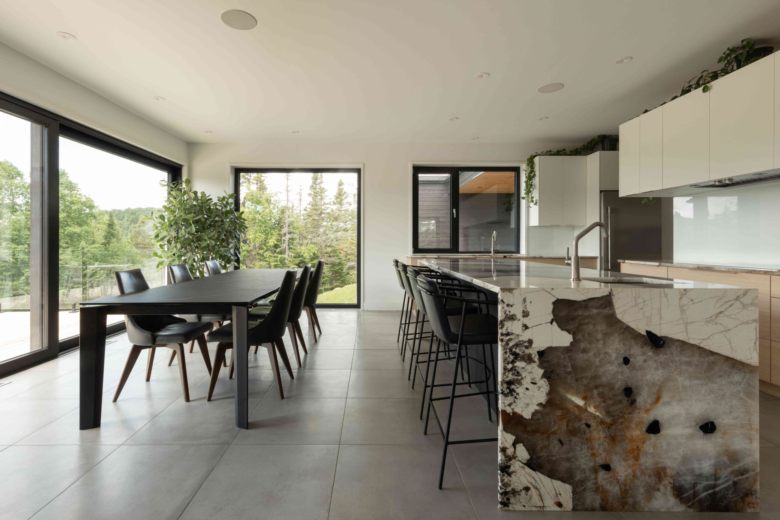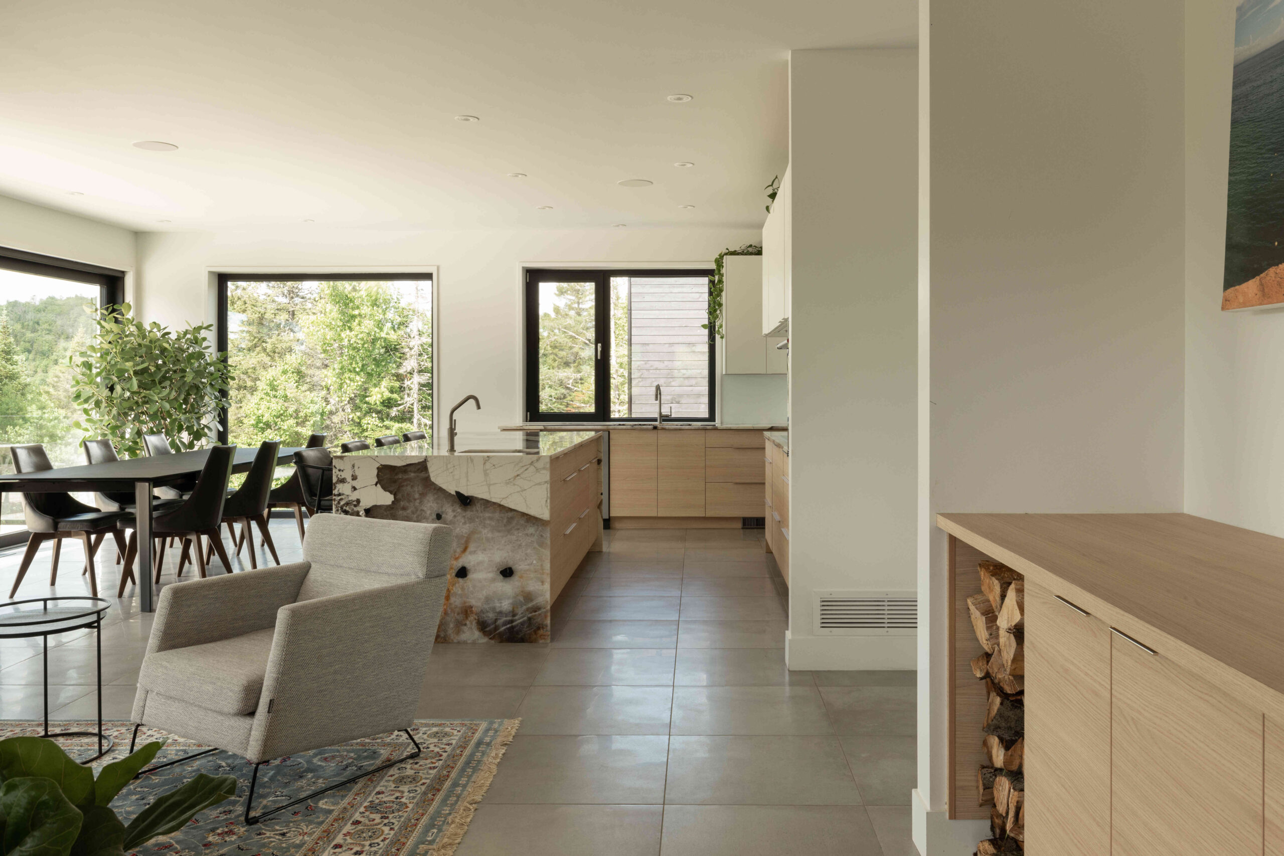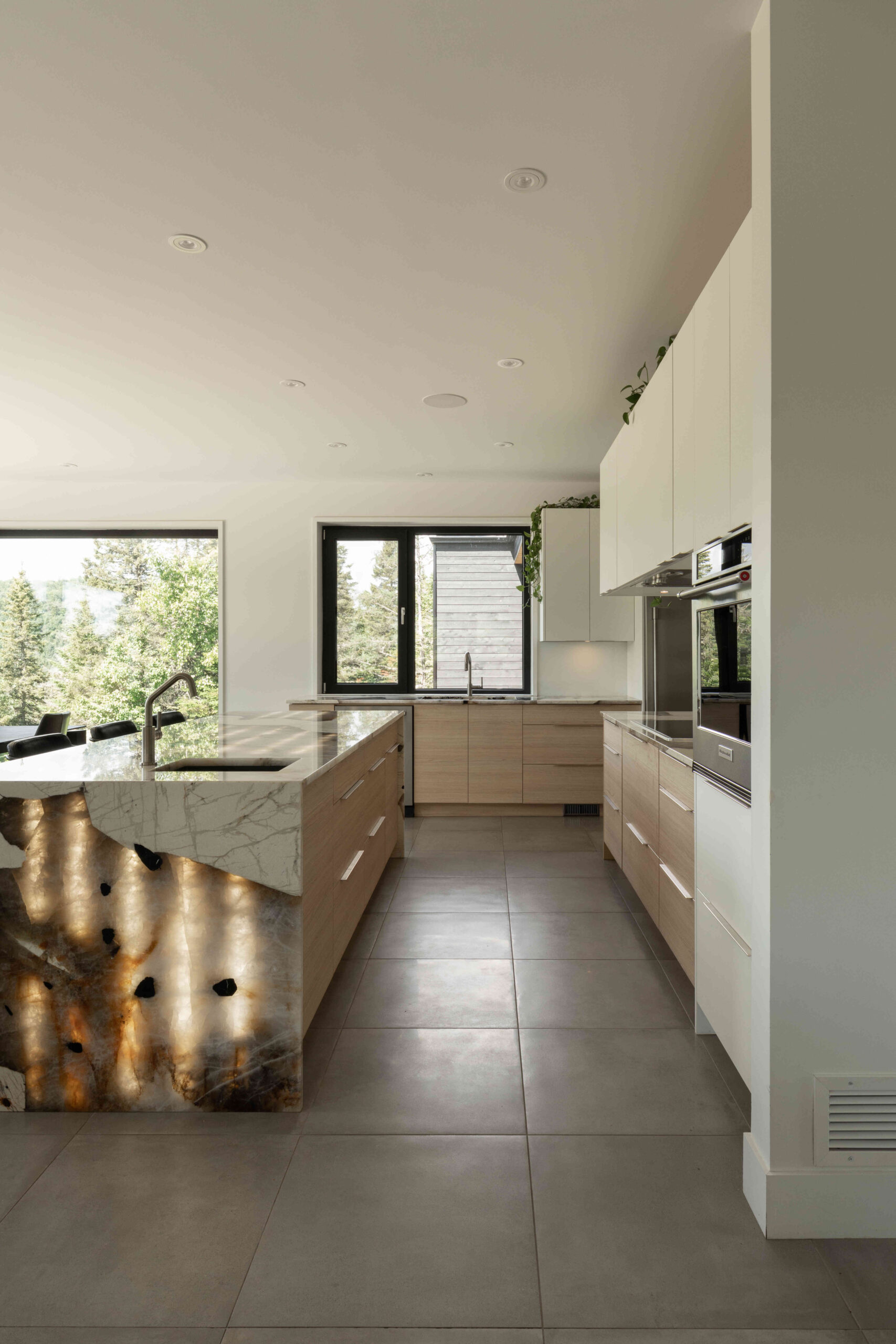 L’aménagement du rez-de-chaussée a été initié par la sélection d’une magnifique pierre pour l’îlot central. Tous les autres choix de matériaux et la palette naturelle ont ensuite découlé de cette pièce maîtresse, afin de lui conférer toute la vedette.