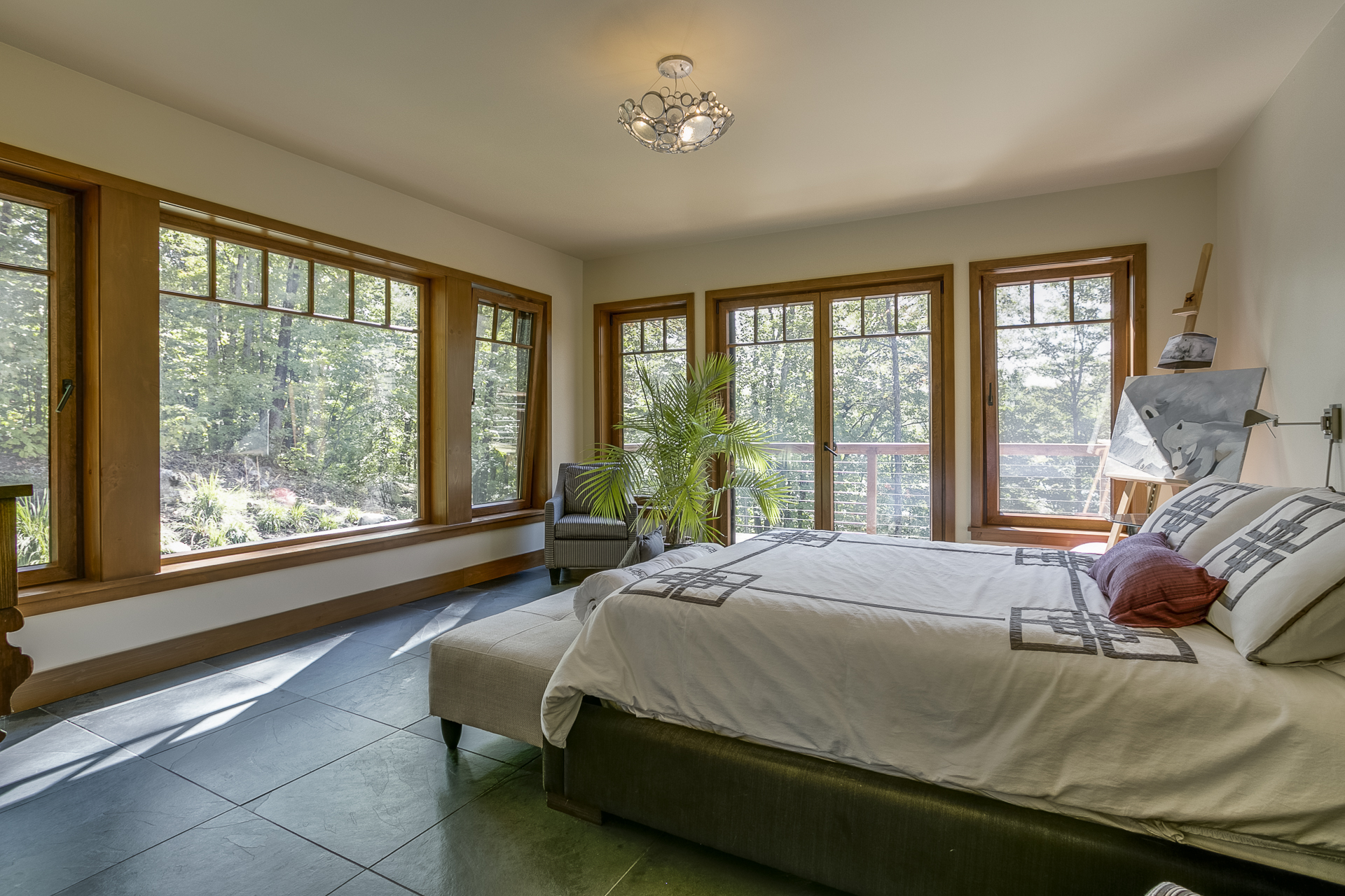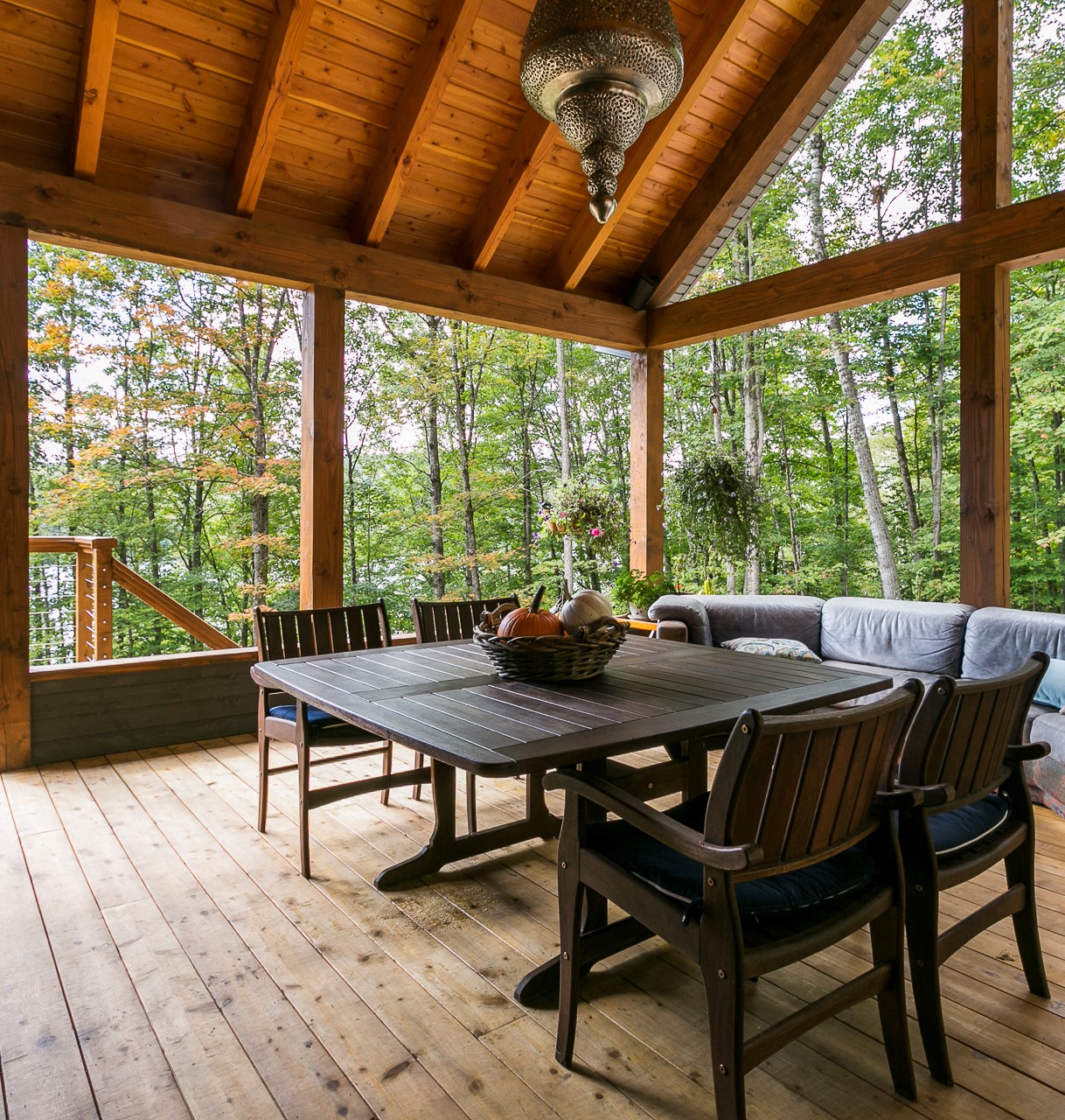 L’intervention a commencé par la conception du plan. Dès l’entrée, un vaste plafond avec des poutres apparentes donne le ton. L’agencement des pièces communes s’organise autour d’une suite principale à gauche, de la cuisine à droite, et du salon face au lac grâce à une immense fenestration, complété par une véranda.