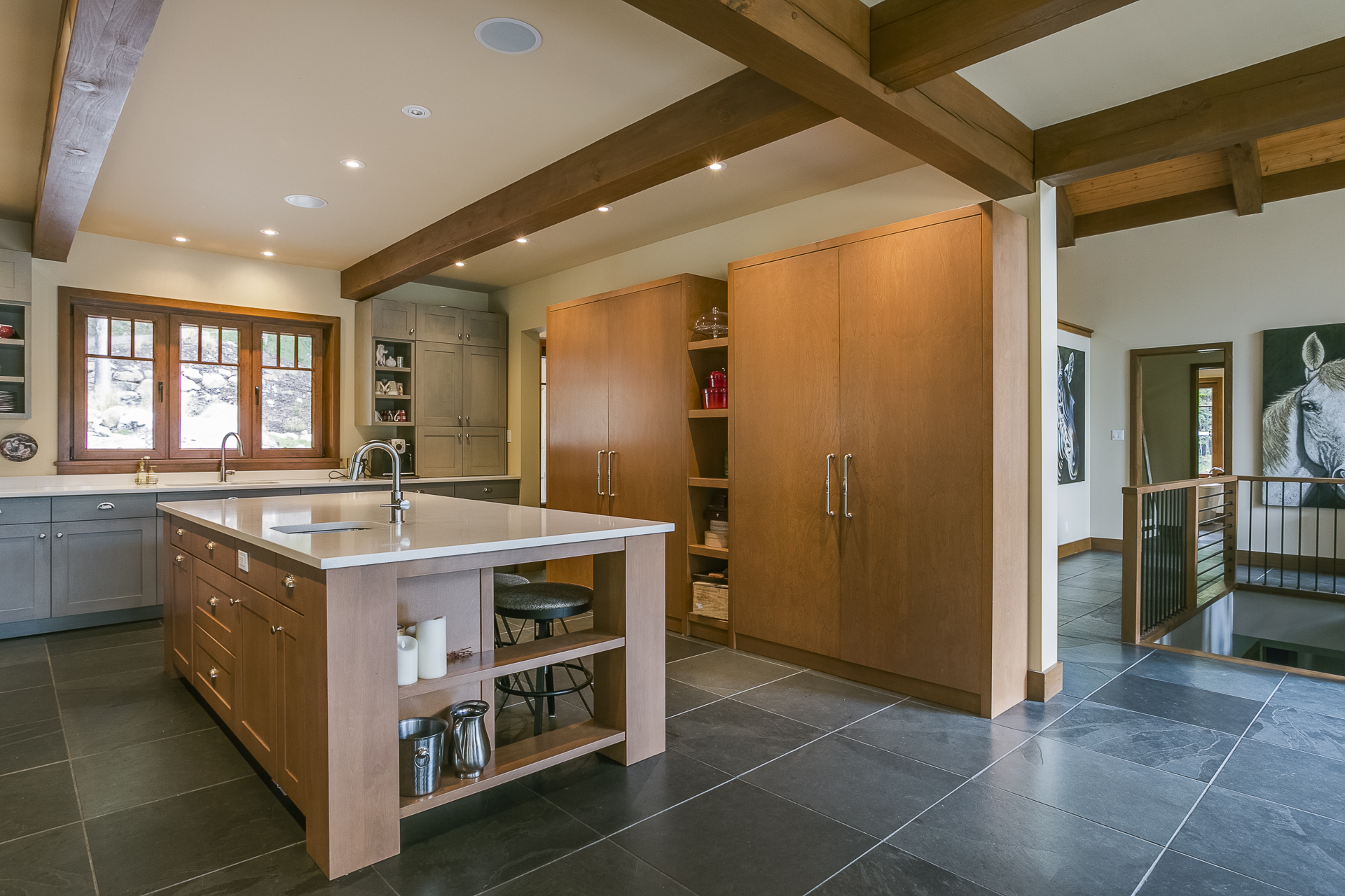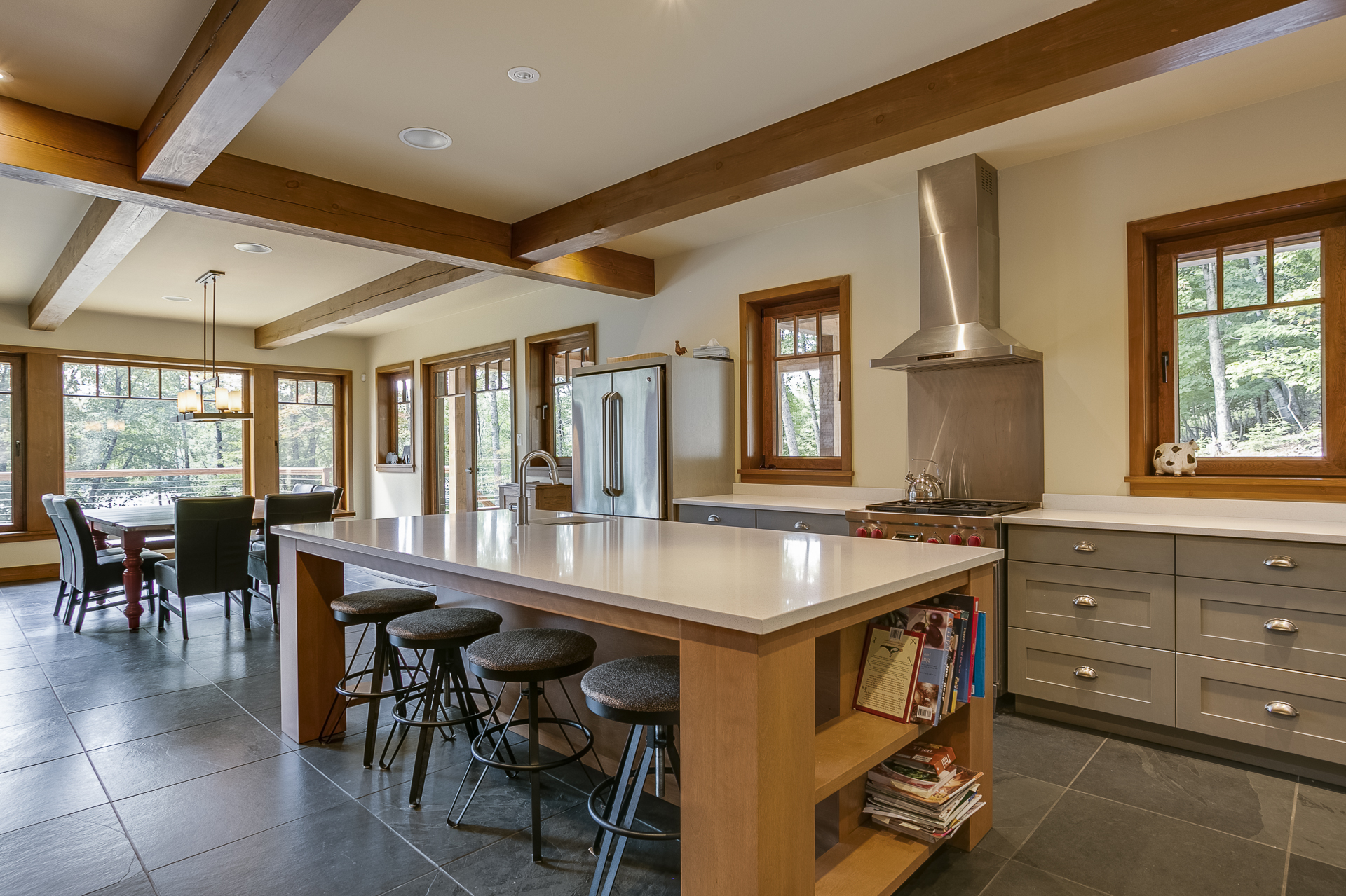 La cuisine, caractérisée par ses portes shaker, respecte une palette de couleurs très naturelles dominée par le gris et le brun. L’espace est centré sur un immense îlot de 54 x 105 pouces. L’élément phare du rez-de-chaussée est l’ardoise Montauk Black qui recouvre toute la surface, y compris la suite des maîtres.