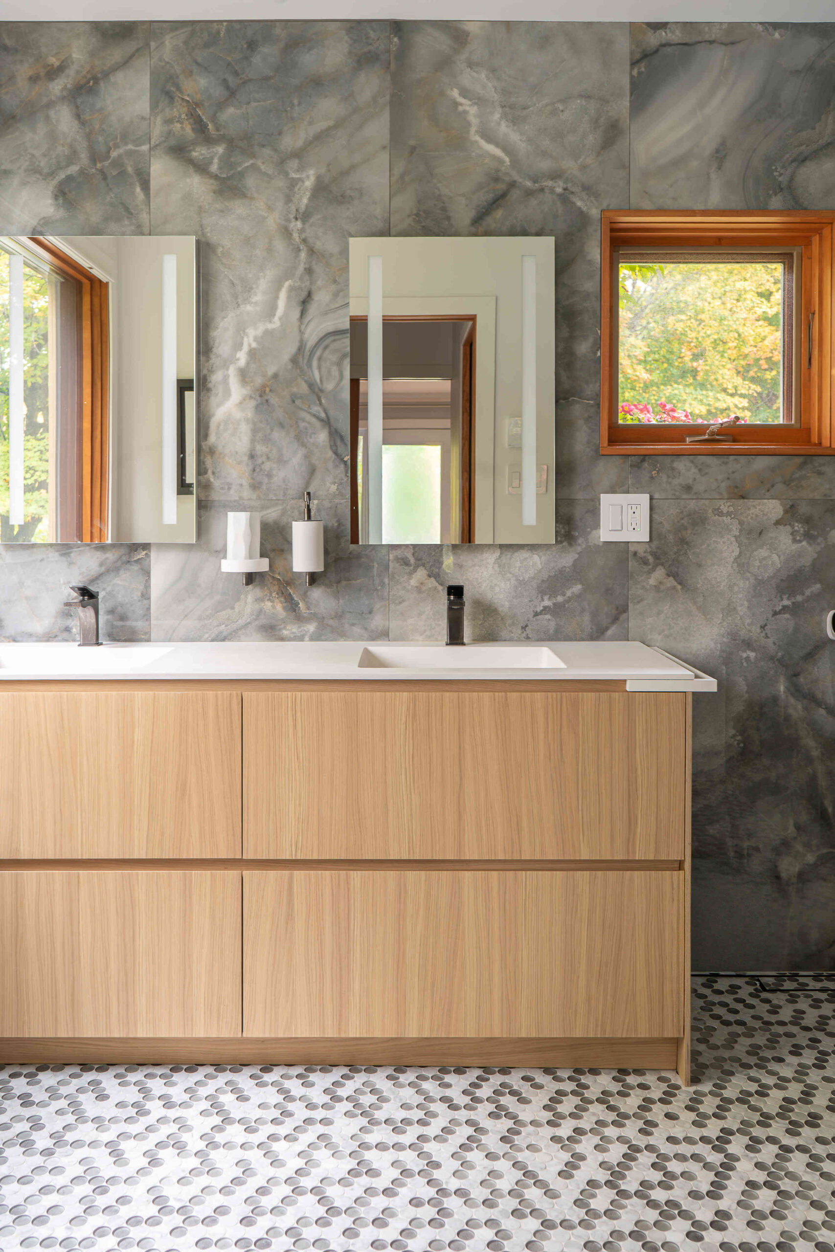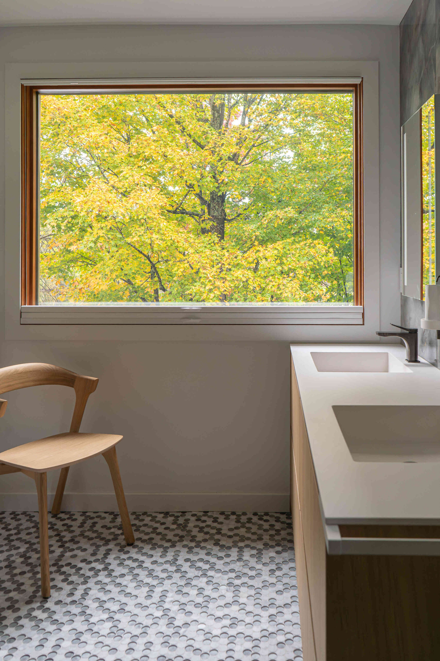 La suite principale a également été réaménagée pour optimiser le rangement et actualiser la salle de bain. Celle-ci est désormais dotée d’une vanité double et d’une douche à vapeur, tout en maximisant la vue sur le lac.